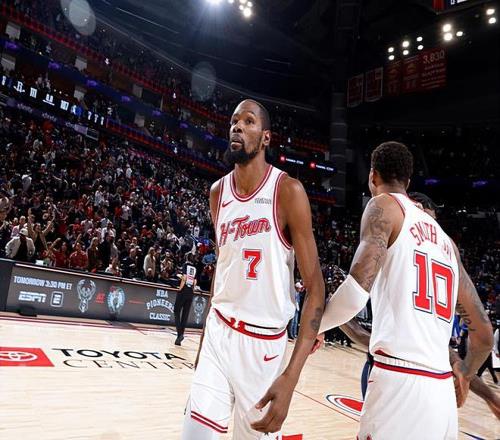 本场比赛中,火箭虽然取得了比赛的胜利,但是球队的先发锋线球星凯文-杜兰特(Kevin Durant)的表现令人大跌眼镜。杜兰特全场出场38分15秒,投篮17中6,三分线外4中1,得到了13分5篮板8助攻2抢断的数据,还有1次失误和2次犯规,正负值为+1。杜兰特在进攻端依然是得到了大量的出手机会,然而他的进攻效率简直是惨不忍睹,他的得分能力和投射能力都完全没有发挥出来。事实上,13分也是杜兰特本赛季的个人单场第二低得分,这也能够说明他的状态有多糟糕。以杜兰特的能力以及最近一段时间的表现,他无疑应该在场上起到更大的作用。如果他的手感稍好一些,火箭可能都会赢得更加轻松一些。