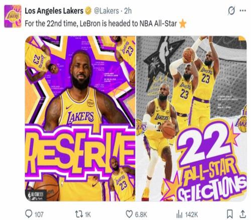 赛前NBA官方公布全明星替补名单,詹姆斯连续22年入选刷新自己保持的NBA历史第一纪录,湖人官方第一时间晒图庆祝。